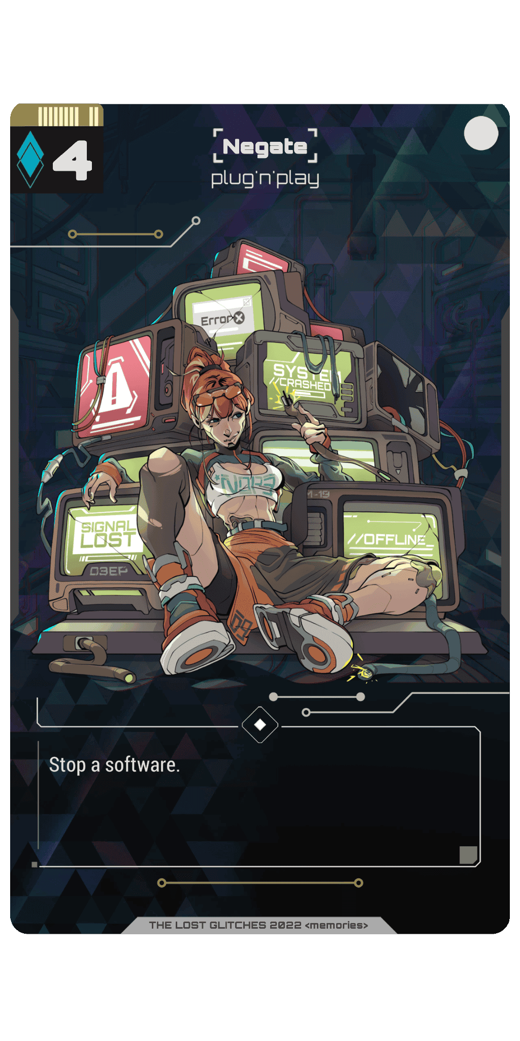 Lost Glitches is a mixture of trading card game (TCG) and role-playing game (RPG). Players choose their syndicate, assemble their deck and gain experience to improve their character's skills and equipment, and eventually conquer the virtual world of Deep Sky.