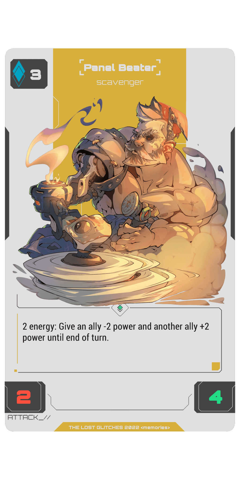 2 energy: Once per turn, give an ally -3/-0 give another ally +3/+0 until end of turn.