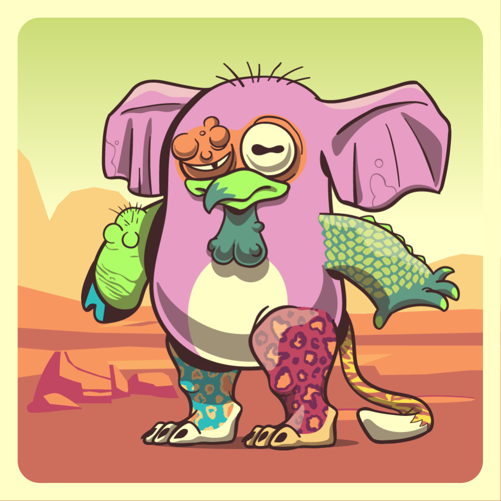 This mutant might have been a Dolphin. It features orange lazy eye, fluo chicken beak, pink elephant ears, dark-green crocodile arm, fluo pig arm, red leopard leg, blue leopard leg and a uranium tiger tail.