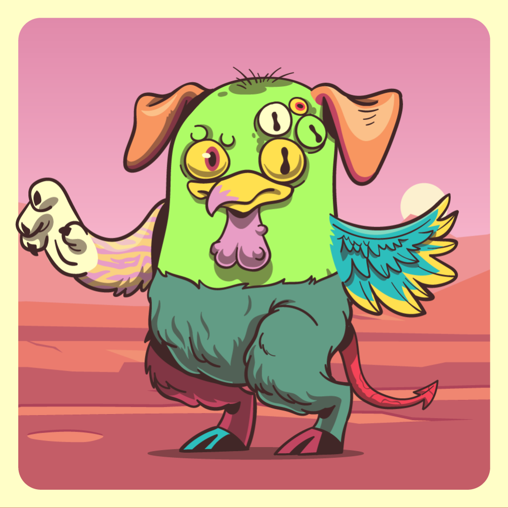 This mutant might have been a Dolphin. It features yellow one+four eyes, ping chicken beak, orange dog ears, blue chicken wing, pink tiger arm, green mad goat leg, red mad goat leg and a red bat tail.