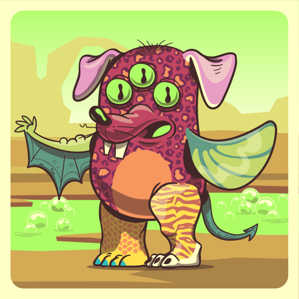 This mutant might have been a Leopard. It features fluo triplet eyes, red rodent snout, pink dog ears, green fish fin, green bat wing, uranium tiger leg, orange crocodile leg and a green bat tail.
