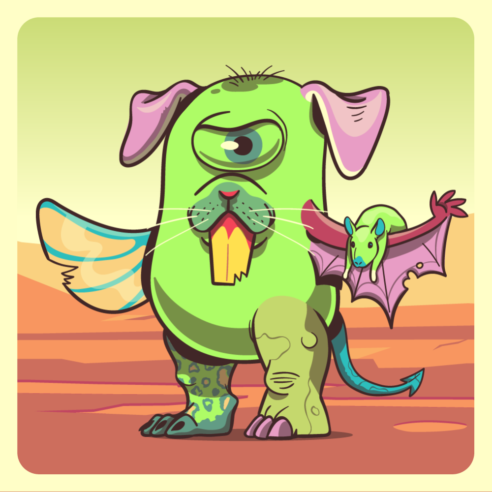 This mutant might have been a Dolphin. It features fluo cyclops eye, green rabbit snout, pink dog ears, pink zen rat-trap bat wing, technicolor fish fin, green rhino leg, fluo leopard leg and a blue bat tail.