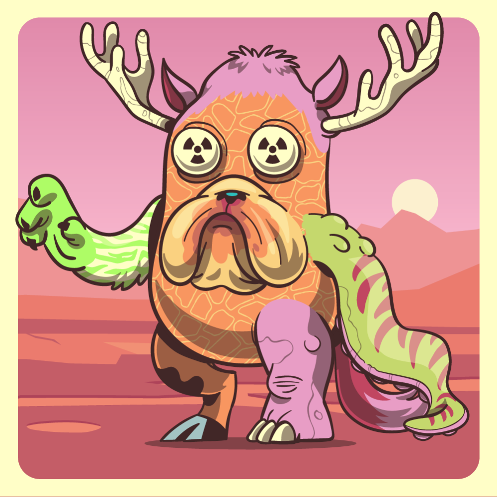 This mutant might have been a Elephant. It features white redioactive eyes, orange bulldog snout, pink moose antlers, green octopus tentacle, fluo tiger arm, pink rhino leg, orange cow leg and a pink fox tail.