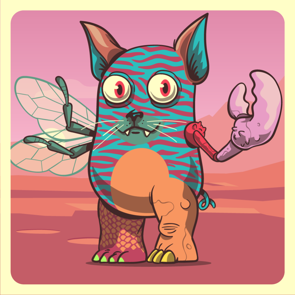 This mutant might have been a Tiger. It features red eyes, green cat snout, blue fox ears, pink lobster claw, green bee wing, orange rhino leg, red crocodile leg and a blue pig tail.