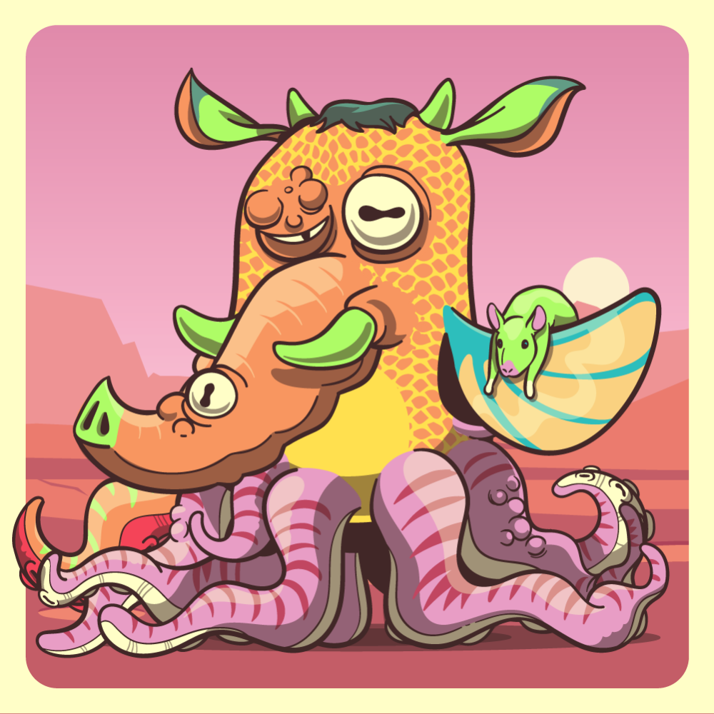 This mutant might have been a Crocodile. It features orange lazy eye, orange elephant trunk, fluo cow ears, technicolor zen rat-trap fish fin, orange octopus tentacle for arms and pink octopus tentacles for legs. Mutants with Octopi legs are very long-lived, for that, they are considered bring good fortune.