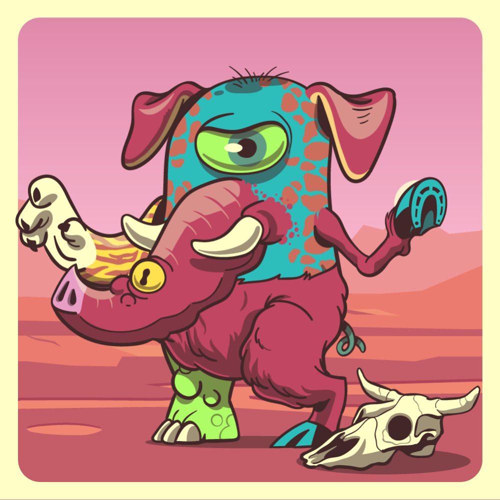 This mutant might have been a Jiraffe. It features fluo cyclops eye, red skull bearing elephant trunk, red dog ears, red horse front leg, uranium tiger arm, red mad goat leg, fluo rhino leg and a green pig tail.
