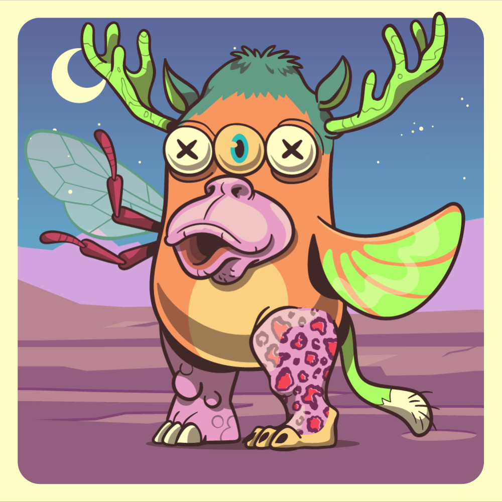 This mutant might have been a Dolphin. It features blue crossed straight-tri-eyes, pink ape ape snout, fluo moose antlers, fluo fin fish, red bee wing, pink leopard leg, pink rhino leg and a fluo ape tail.