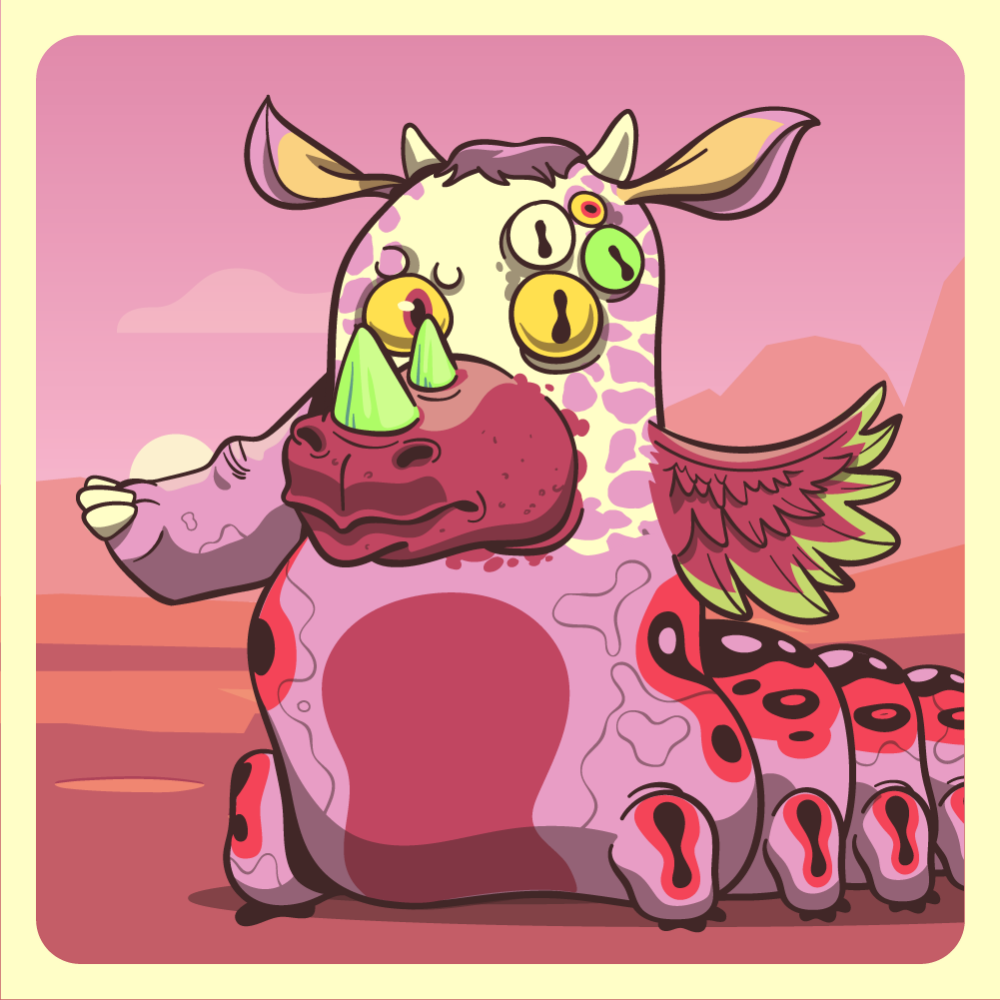 This mutant might have been a Jiraffe. It features yellow one+four eyes, red rhino horns, pink cow ears, red chicken wing, pink rhino arm for arms and pink caterpillar abdomen. Mutants with caterpillar abdomen are very resilient. They can knit silk with their tail!