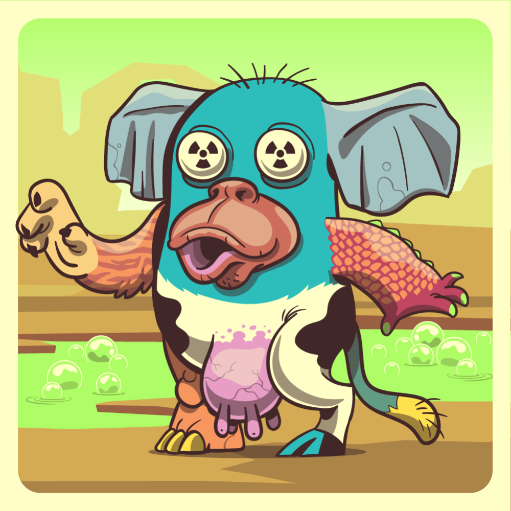 This mutant might have been a Dolphin. It features white redioactive eyes, red ape snout, blue elephant ears, red crocodile arm, orange tiger arm, white cow leg, orange rhino leg and a uranium ape tail.