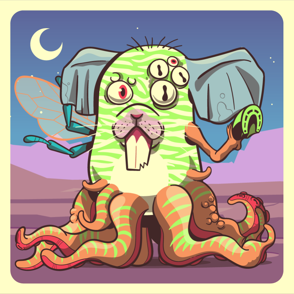 This mutant might have been a Tiger. It features red one+four eyes, pink rabbit snout, blue elephant ears, orange horse front leg, blue bee wing for arms and orange octopus tentacles for legs. Mutants with Octopi legs are very long-lived, for that, they are considered bring good fortune.