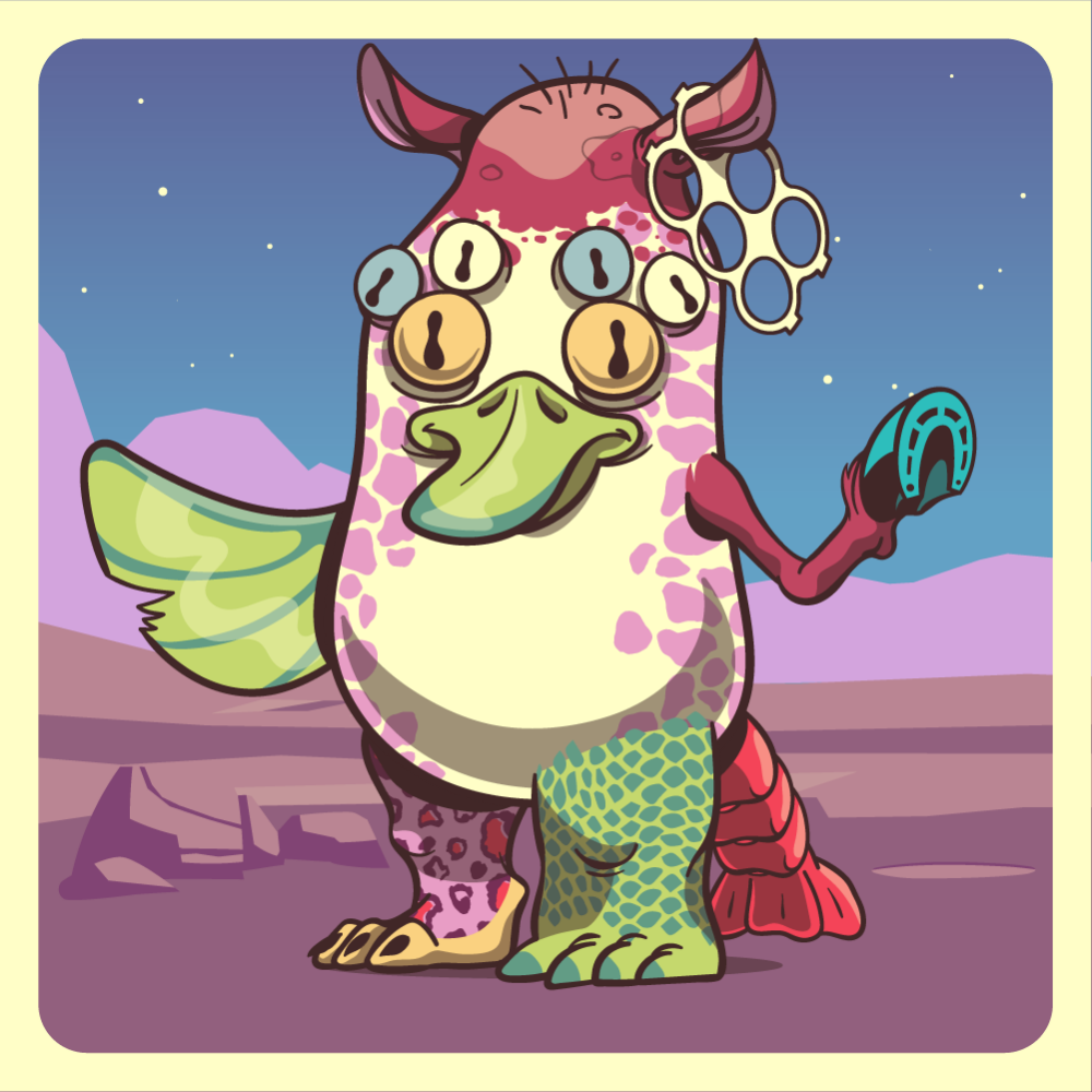 This mutant might have been a Jiraffe. It features blue spider eyes, green duck beak, yokes trapped red rhino ears, red horse front leg, green fish fin, dense-green crocodile leg, pink leopard leg and a red lobster tail.