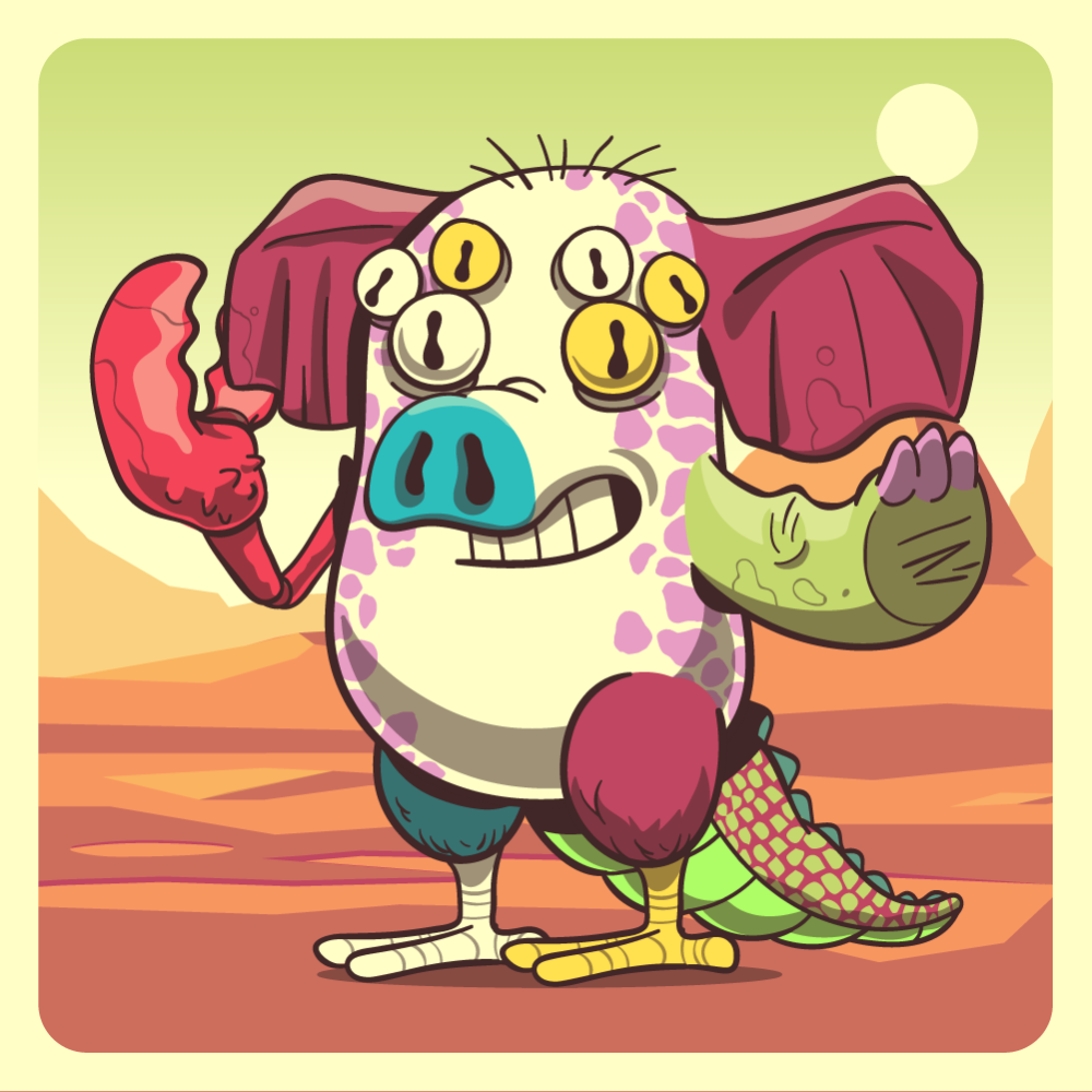 This mutant might have been a Jiraffe. It features technicolor spider eyes, blue pig snout, red elephant ears, green orange, red lobster claw, red chicken leg, blue chicken leg and a orange crocodile tail.