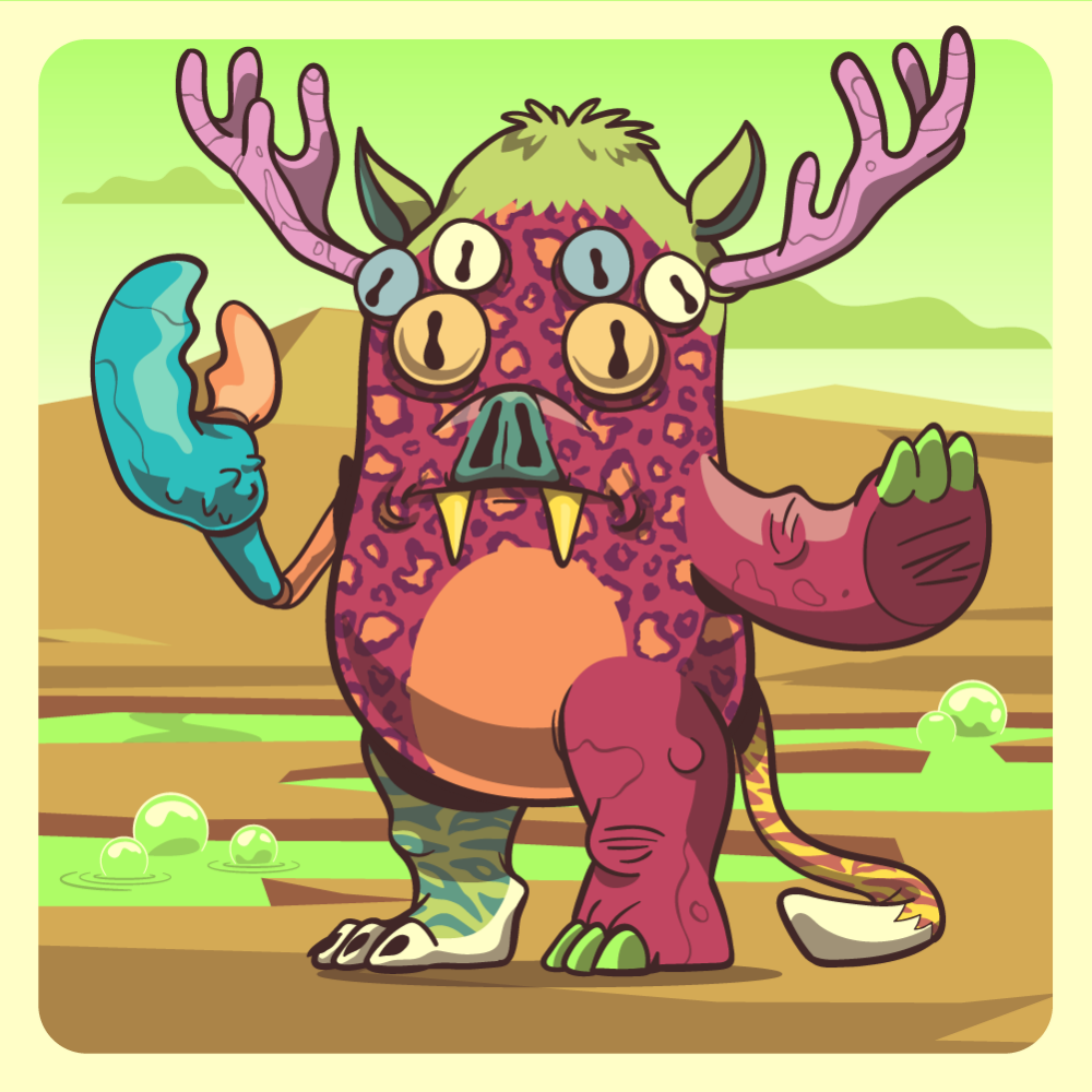 This mutant might have been a Leopard. It features blue spider eyes, green bat snout, green moose antlers, red rhino arm, blue lobster claw, red rhino leg, green tiger leg and a uranium tiger tail.