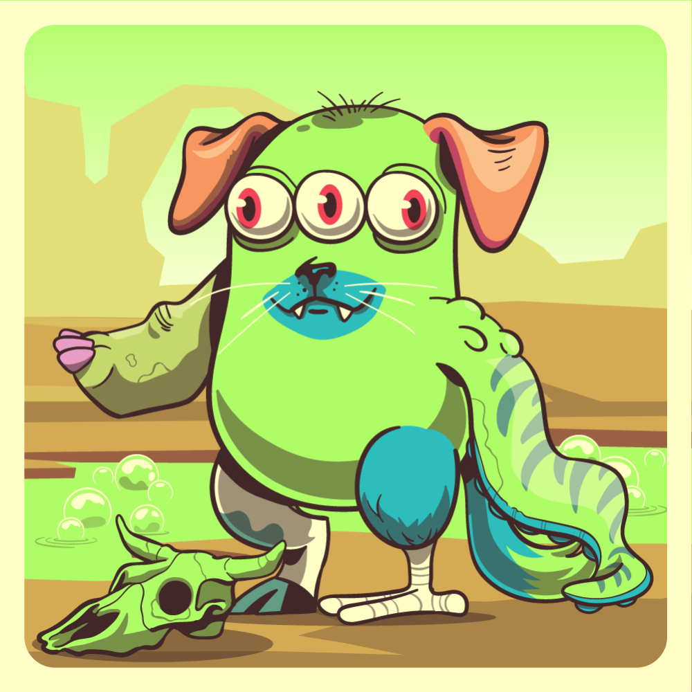 This mutant might have been a Dolphin. It features three inline eyes red, blue yellowcake cow skull bearer cat snout, orange dog ears, fluo octopus tentacle, green rhino arm, blue chicken leg, green cow leg and a blue fox tail.
