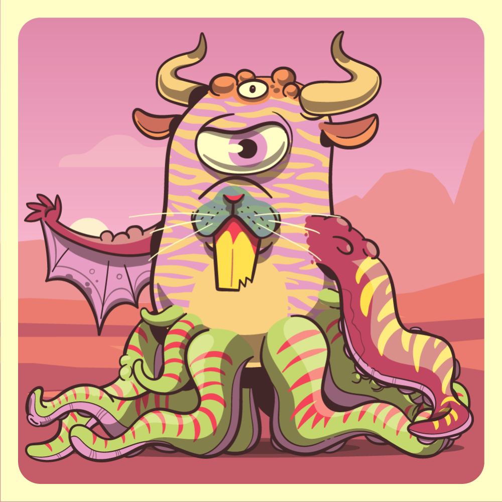 This mutant might have been a Tiger. It features pink cyclops eye, green rabbit snout, orange bull horns, red octopus tentacle, pink bat wing for arms and green octopus tentacles for legs. Mutants with Octopi legs are very long-lived, for that, they are considered bring good fortune.