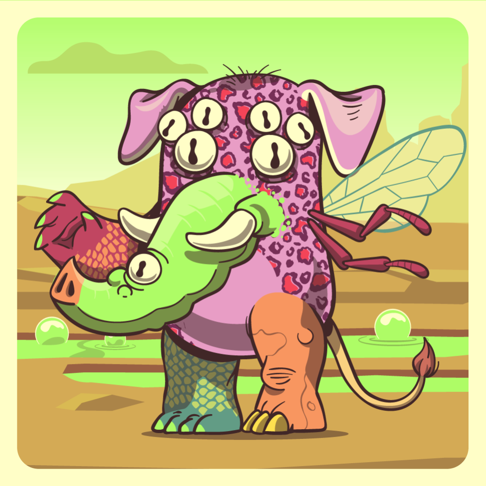 This mutant might have been a Leopard. It features white spider eyes, fluo elephant trunk, pink dog ears, red bee wing, red crocodile arm, orange rhino leg, green crocodile leg and a orange lion tail.