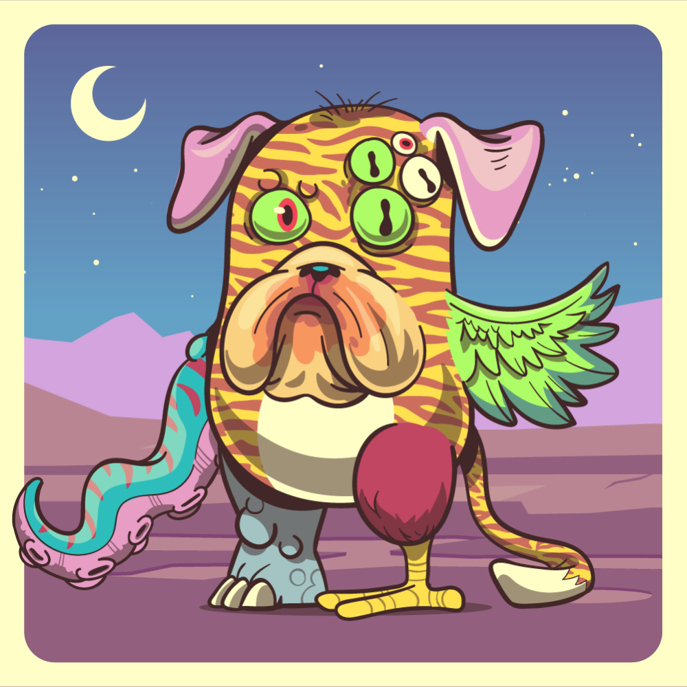 This mutant might have been a Tiger. It features fluo one+four eyes, orange bulldog snout, pink dog ears, fluo chicken wing, blue octopus tentacle, red chicken leg, blue rhino leg and a uranium tiger tail.
