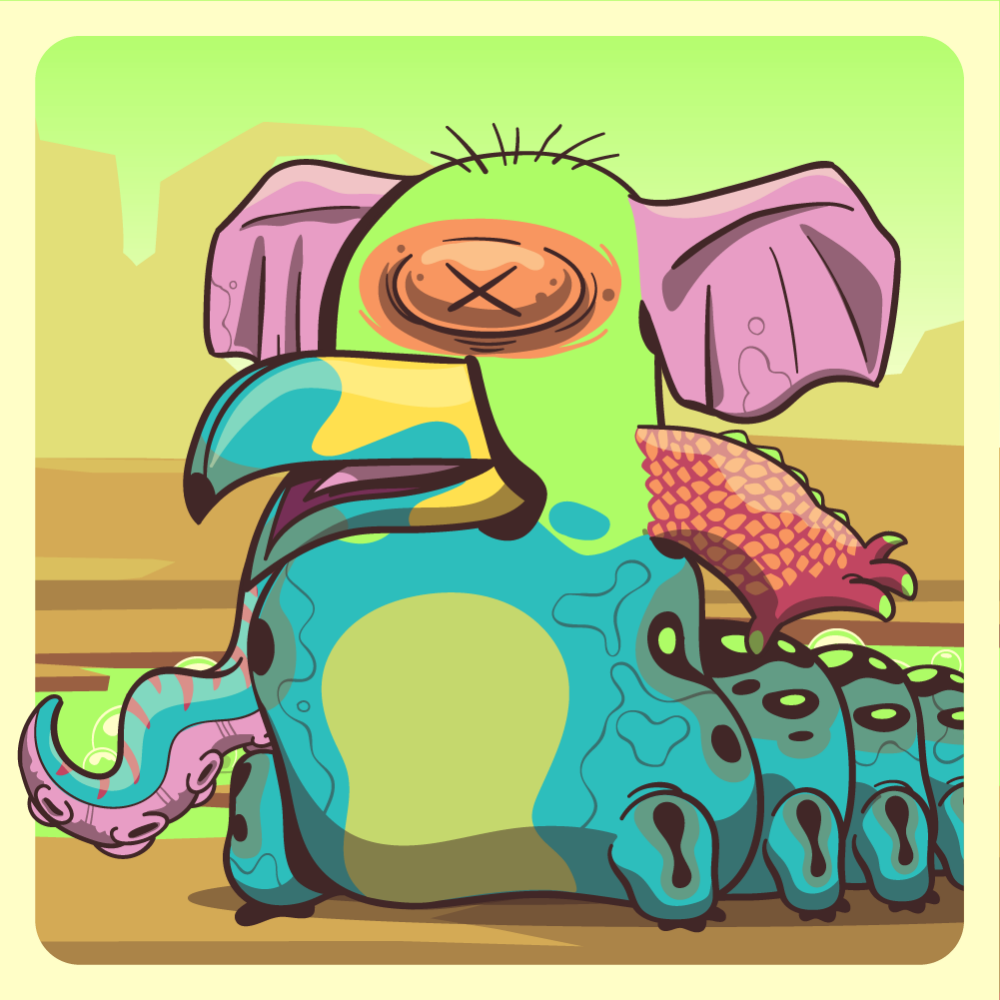This mutant might have been a Dolphin. It features orange mole eye, blue toucan beak, pink elephant ears, red crocodile arm, blue octopus tentacle for arms and blue caterpillar abdomen. Mutants with caterpillar abdomen are very resilient. They can knit silk with their tail!