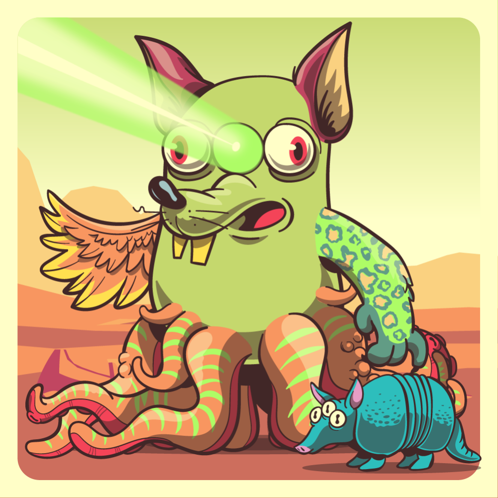 This mutant might have been a Dolphin. It features laser straight-tri-eyes, mutantdillo green rodent snout, red fox ears, fluo leopard arm, orange chicken wing for arms and orange octopus tentacles for legs. Mutants with Octopi legs are very long-lived, for that, they are considered bring good fortune.