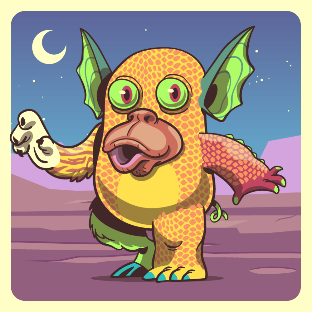 This mutant might have been a Crocodile. It features fluo eyes, red ape snout, fluo bat ears, red crocodile arm, uranium tiger arm, orange crocodile leg, fluo mad goat leg and a fluo pig tail.