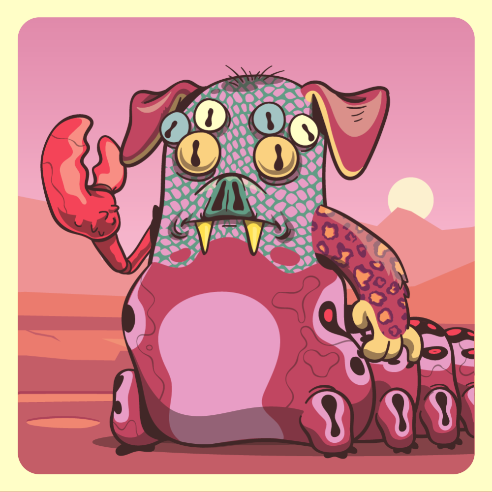 This mutant might have been a Crocodile. It features blue spider eyes, green bat snout, red dog ears, red leopard arm, red lobster claw for arms and red caterpillar abdomen. Mutants with caterpillar abdomen are very resilient. They can knit silk with their tail!
