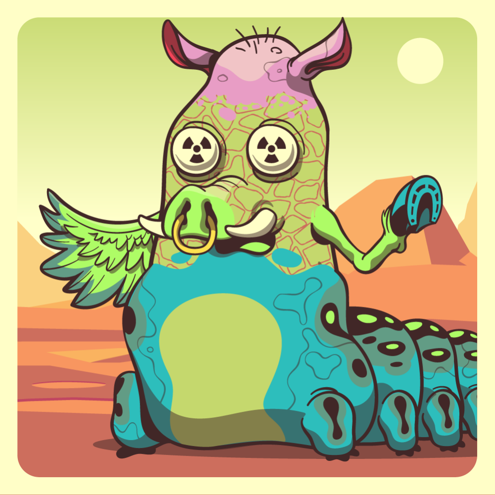 This mutant might have been a Elephant. It features white redioactive eyes, fluo boar snout, pink rhino ears, fluo horse front leg, fluo chicken wing for arms and blue caterpillar abdomen. Mutants with caterpillar abdomen are very resilient. They can knit silk with their tail!