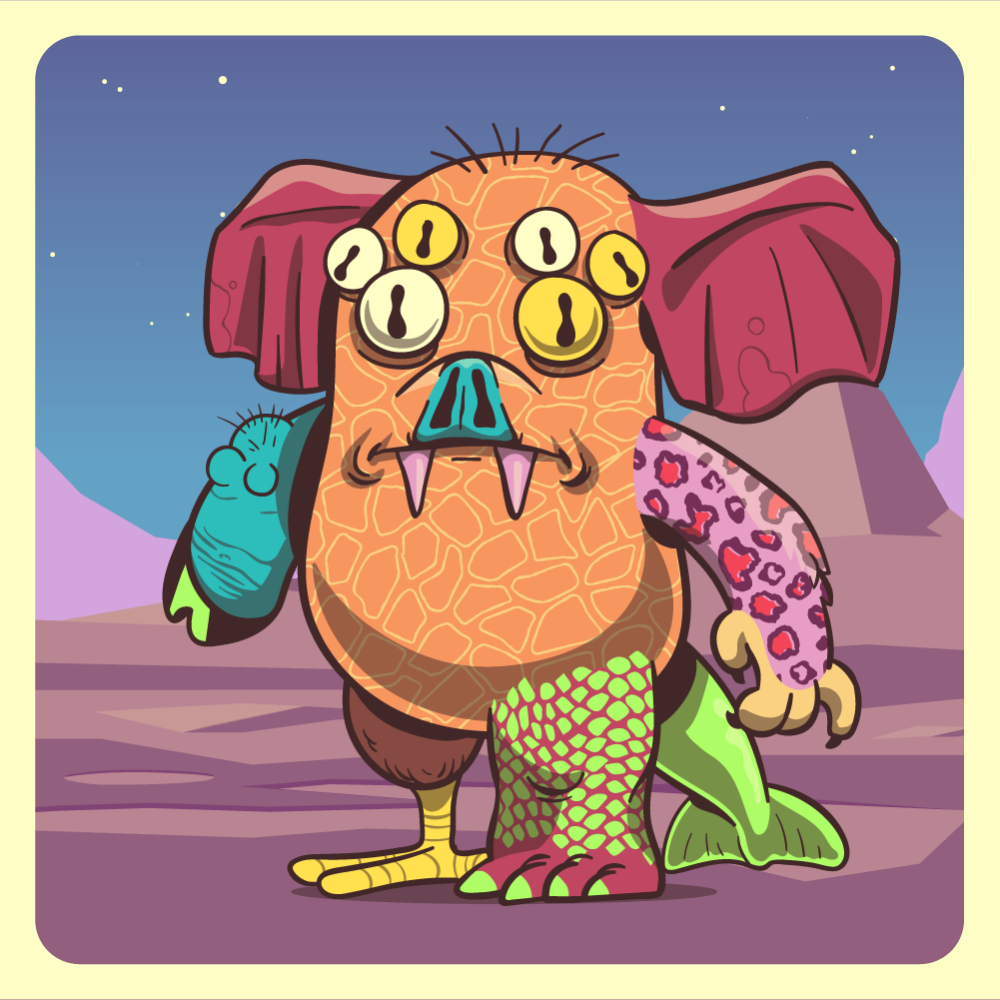 This mutant might have been a Elephant. It features technicolor spider eyes, blue bat snout, red elephant ears, pink leopard arm, blue pig arm, fluo crocodile leg, brown chicken leg and a fluo dolphin tail.