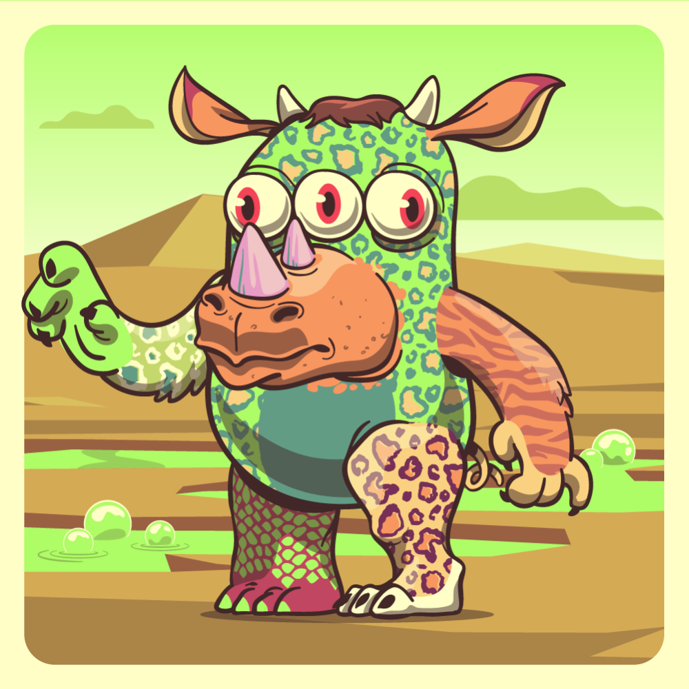 This mutant might have been a Leopard. It features three inline eyes red, orange rhino horns, orange cow ears, orange tiger arm, green leopard arm, orange leopard leg, fluo crocodile leg and a orange pig tail.