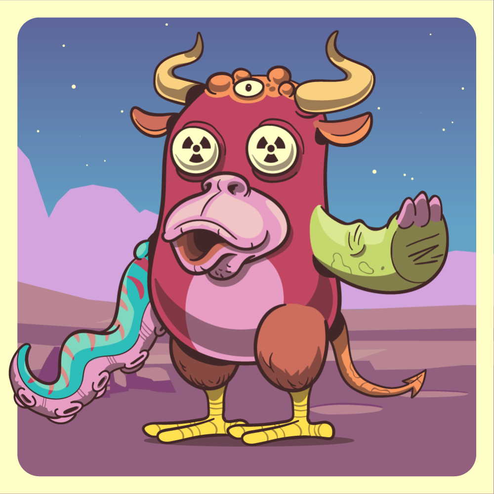 This mutant might have been a Dolphin. It features white redioactive eyes, pink ape ape snout, orange bull horns, green orange, blue octopus tentacle, brown chicken leg, brown chicken leg and a orange bat tail.