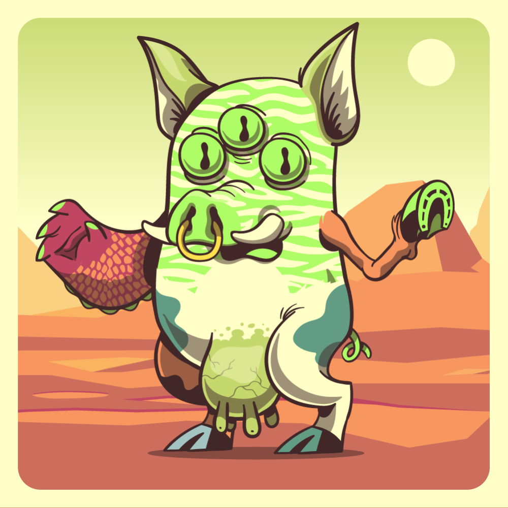 This mutant might have been a Tiger. It features fluo triplet eyes, fluo boar snout, green fox ears, orange horse front leg, red crocodile arm, green cow leg, orange cow leg and a fluo pig tail.
