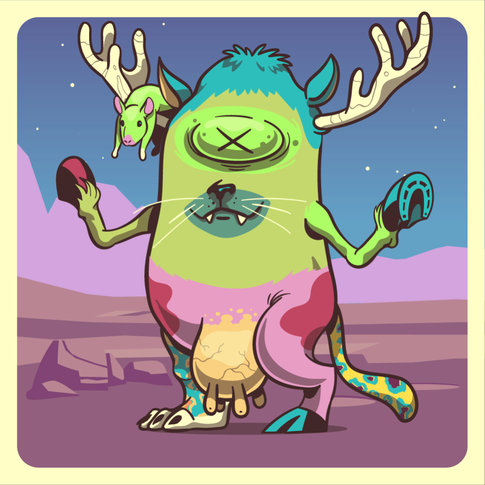 This mutant might have been a Dolphin. It features fluo mole eye, green cat snout, zen rat-trap blue moose antlers, fluo horse front leg, green horse front leg, pink cow leg, blue leopard leg and a uranium leopard tail.