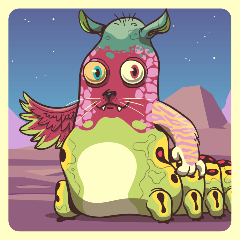 This mutant might have been a Jiraffe. It features blue heterochromia right eye, red cat snout, green rhino ears, pink tiger arm, red chicken wing for arms and green caterpillar abdomen. Mutants with caterpillar abdomen are very resilient. They can knit silk with their tail!