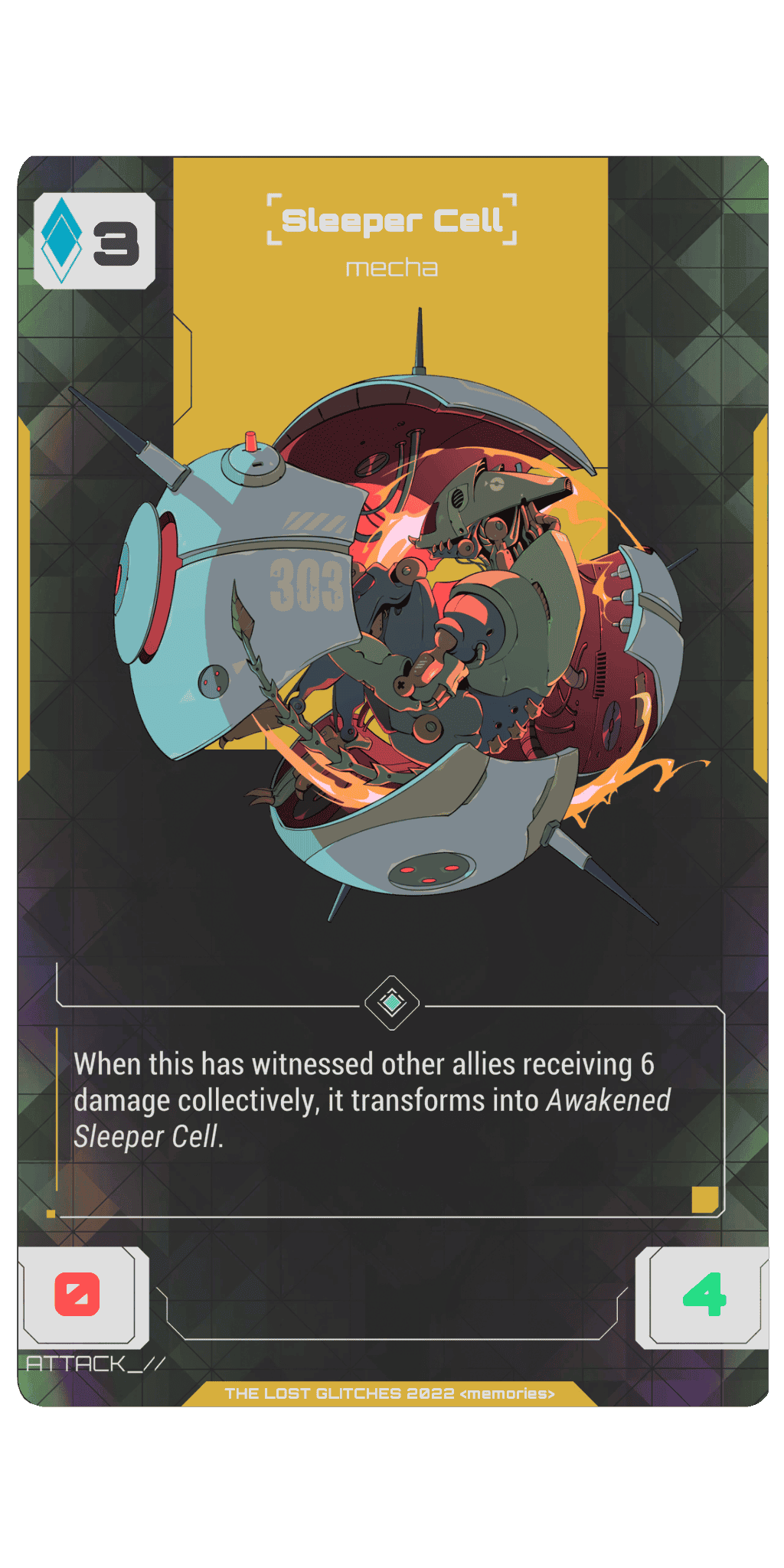 When Sleeper Cell has witnessed allies receiving 4 damage collectively, Sleeper Cell becomes 5/4 with Overflow.