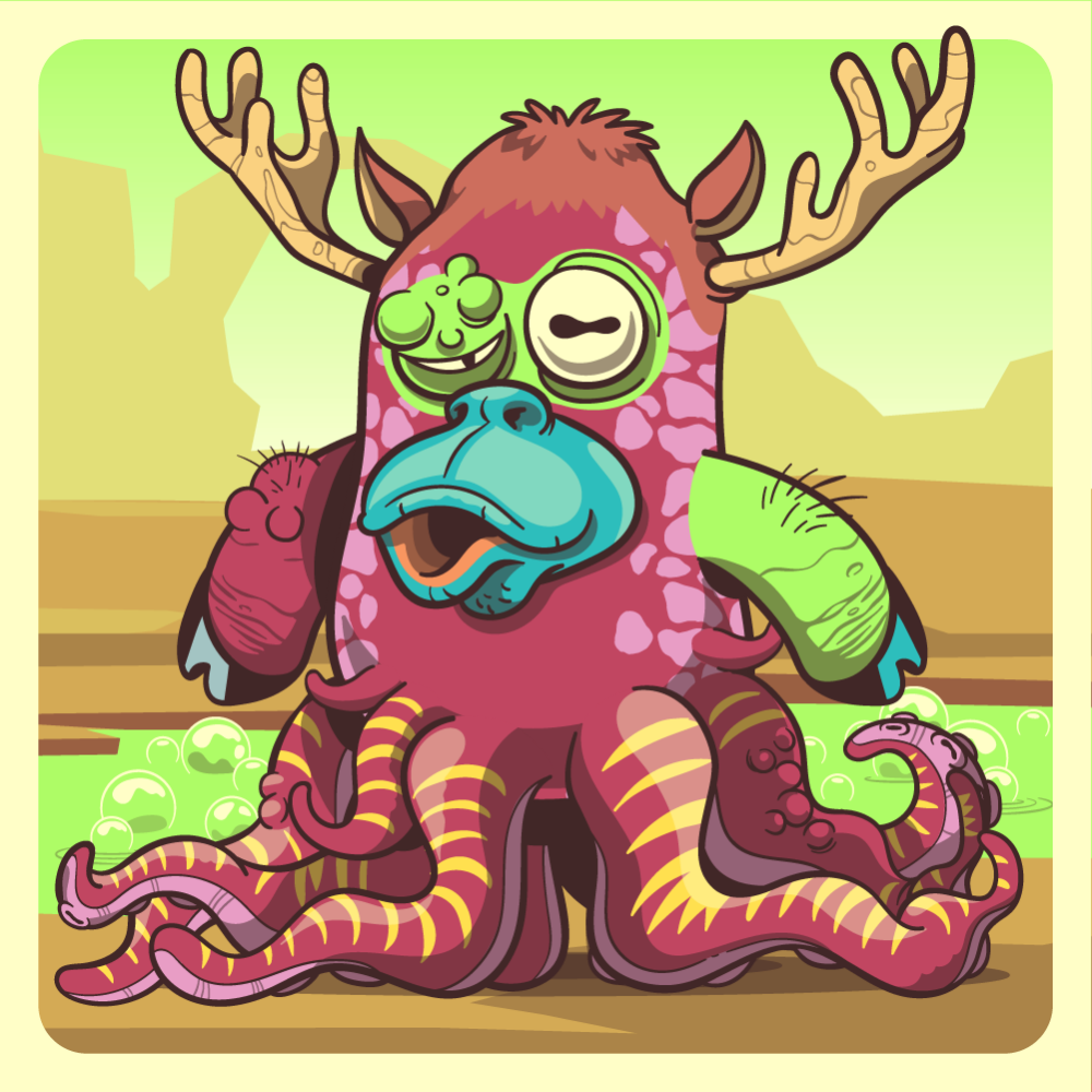 This mutant might have been a Jiraffe. It features fluo lazy eye, blue ape snout, orange moose antlers, fluo pig arm, red pig arm for arms and red octopus tentacles for legs. Mutants with Octopi legs are very long-lived, for that, they are considered bring good fortune.