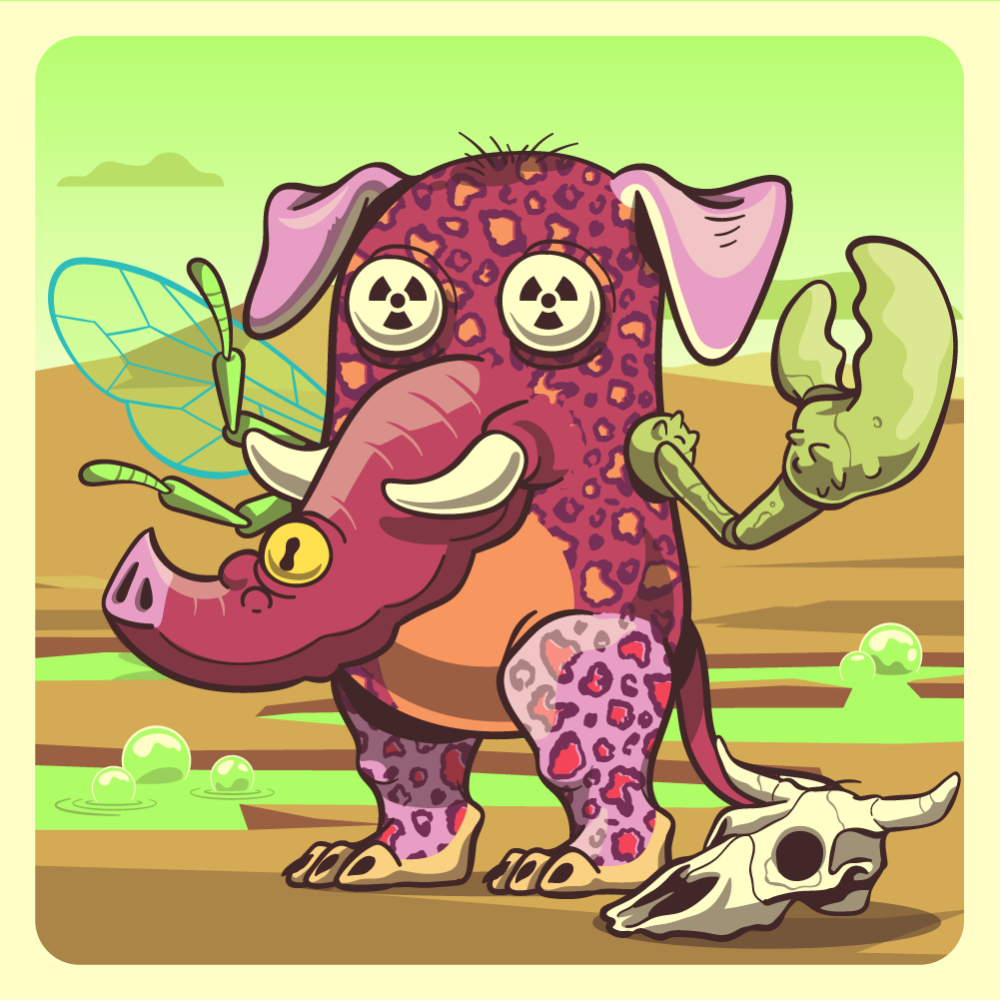 This mutant might have been a Leopard. It features white redioactive eyes, red skull bearing elephant trunk, pink dog ears, green lobster claw, fluo bee wing, pink leopard leg, pink leopard leg and a red ape tail.
