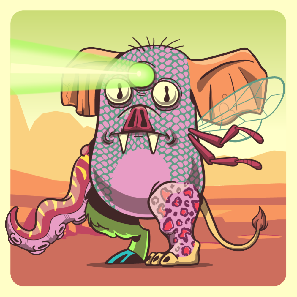 This mutant might have been a Crocodile. It features green laser+two eyes, red bat snout, orange elephant ears, red bee wing, red octopus tentacle, pink leopard leg, fluo mad goat leg and a orange lion tail.