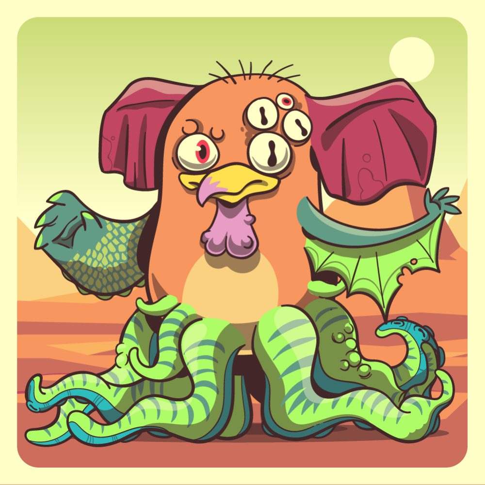 This mutant might have been a Dolphin. It features red one+four eyes, ping chicken beak, red elephant ears, fluo bat wing, dark-green crocodile arm for arms and fluo octopus tentacles for legs. Mutants with Octopi legs are very long-lived, for that, they are considered bring good fortune.