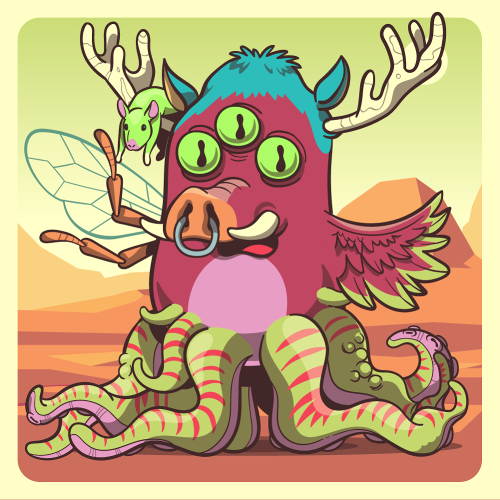 This mutant might have been a Dolphin. It features fluo triplet eyes, orange boar snout, zen rat-trap blue moose antlers, red chicken wing, orange bee wing for arms and green octopus tentacles for legs. Mutants with Octopi legs are very long-lived, for that, they are considered bring good fortune.