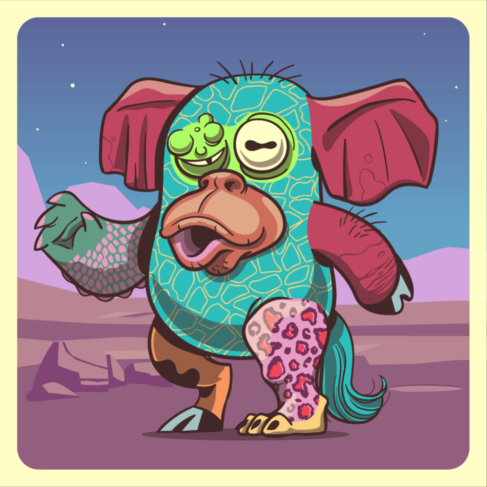 This mutant might have been a Elephant. It features fluo lazy eye, red ape snout, red elephant ears, red pig arm, pink crocodile arm, pink leopard leg, orange cow leg and a blue horse tail.