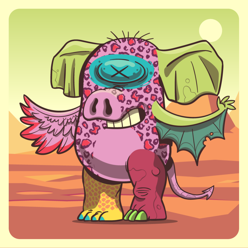 This mutant might have been a Leopard. It features blue mole eye, pink pig snout, green elephant ears, green bat wing, pink chicken wing, red rhino leg, orange crocodile leg and a pink bat tail.