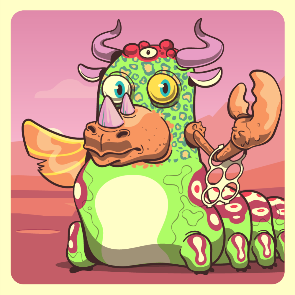 This mutant might have been a Leopard. It features blue heterochromia left eye, orange rhino horns, pink bull horns, yokes trapped orange lobster claw, uranium fish fish for arms and fluo caterpillar abdomen. Mutants with caterpillar abdomen are very resilient. They can knit silk with their tail!