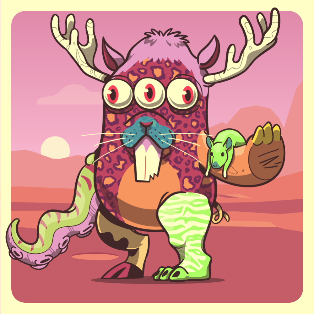 This mutant might have been a Leopard. It features three inline eyes red, blue rabbit snout, pink moose antlers, orange zen rat-trap rhino arm, green octopus tentacle, fluo tiger leg, uranium cow leg and a orange pig tail.