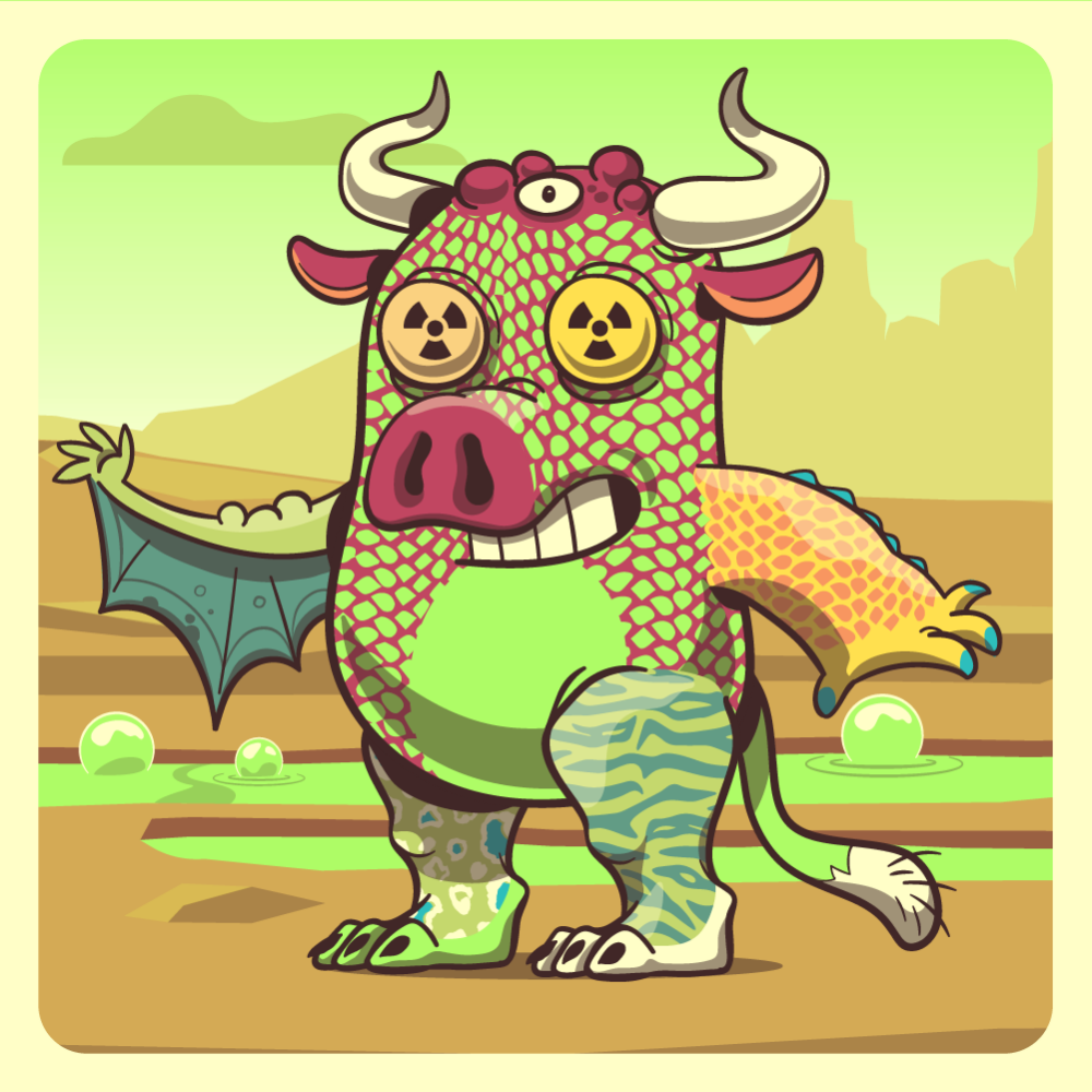 This mutant might have been a Crocodile. It features technicolor redioactive eyes, red pig snout, red bull horns, uranium crocodile arm, green bat wing, green tiger leg, green leopard leg and a fluo ape tail.