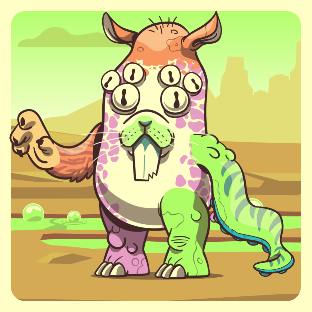 This mutant might have been a Jiraffe. It features white spider eyes, fluo rabbit snout, orange rhino ears, fluo octopus tentacle, orange tiger arm, fluo rhino leg, pink rhino leg and a pink pig tail.