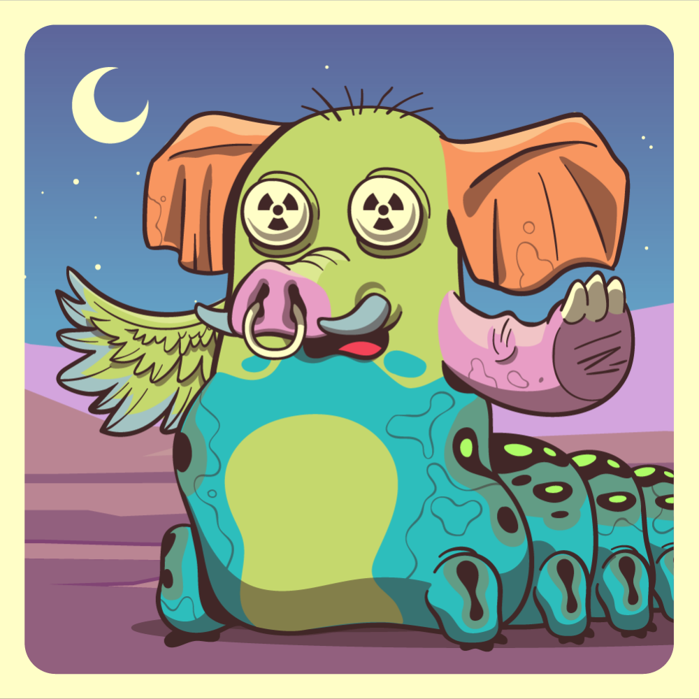 This mutant might have been a Dolphin. It features white redioactive eyes, pink boar snout, orange elephant ears, pink rhino arm, green chicken wing for arms and blue caterpillar abdomen. Mutants with caterpillar abdomen are very resilient. They can knit silk with their tail!