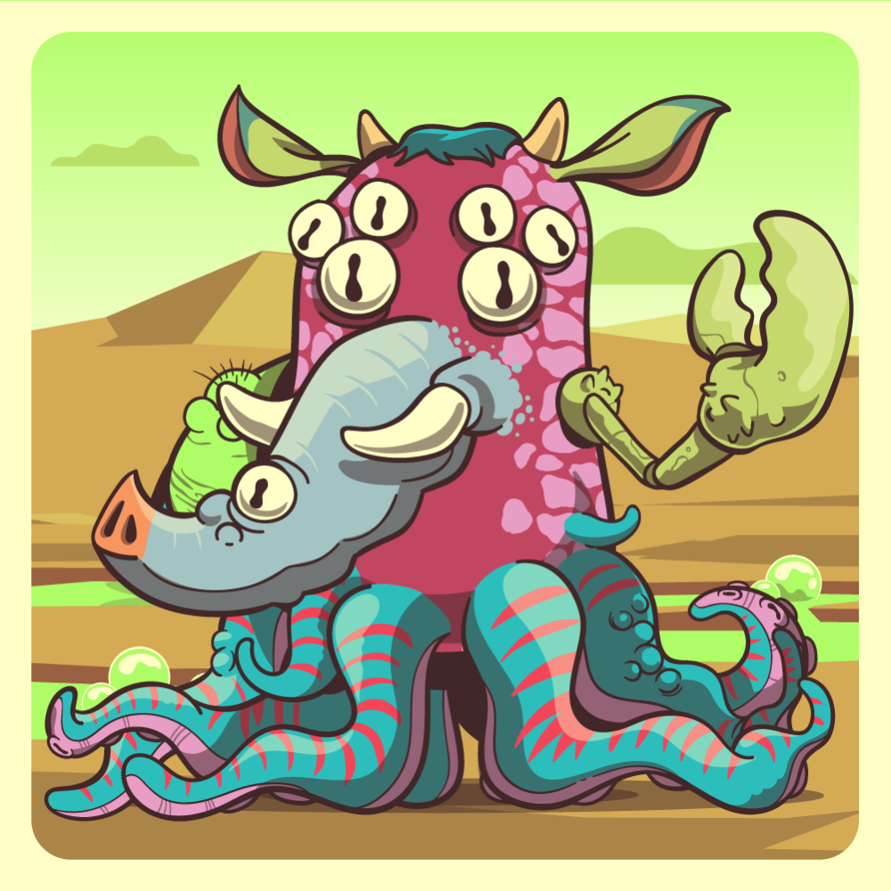 This mutant might have been a Jiraffe. It features white spider eyes, blue elephant trunk, green cow ears, green lobster claw, fluo pig arm for arms and blue octopus tentacles for legs. Mutants with Octopi legs are very long-lived, for that, they are considered bring good fortune.