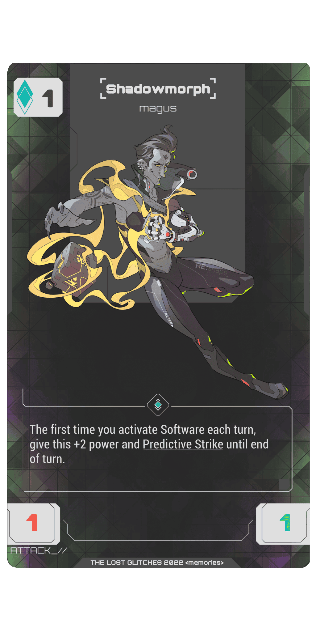 Once per turn, whenever you activate Software, Shadowmorph get's +2/+0 and receives Predictive Strike until end of turn.