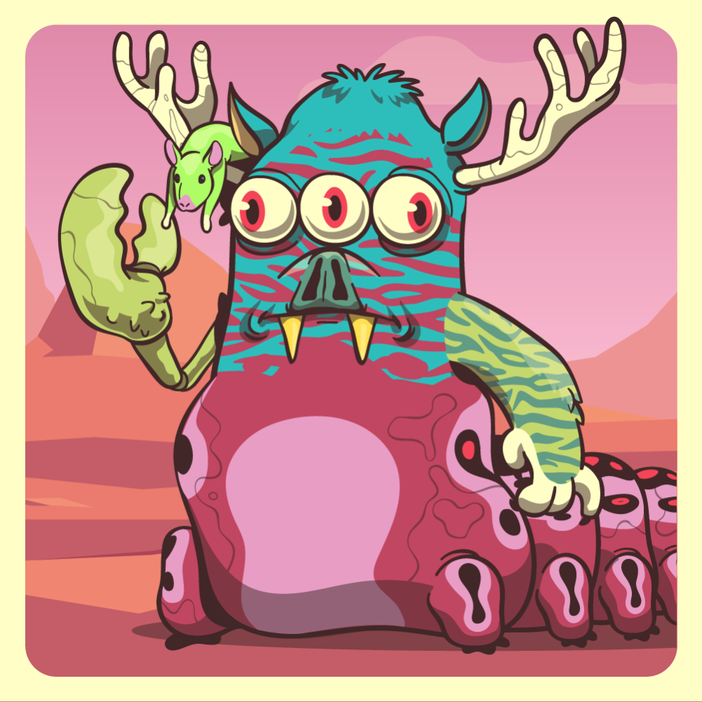 This mutant might have been a Tiger. It features three inline eyes red, green bat snout, zen rat-trap blue moose antlers, green tiger arm, green lobster claw for arms and red caterpillar abdomen. Mutants with caterpillar abdomen are very resilient. They can knit silk with their tail!