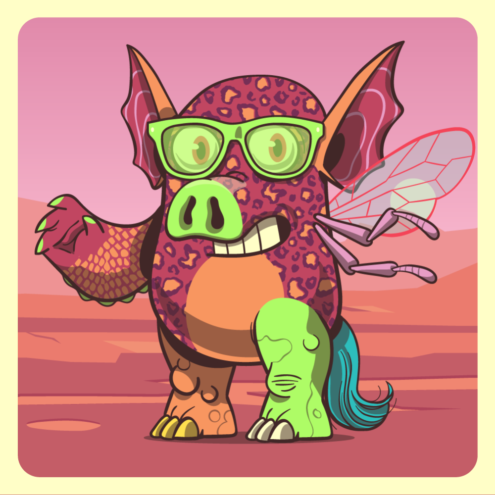 This mutant might have been a Leopard. It features green sunglases, fluo pig snout, red bat ears, pink bee wing, red crocodile arm, fluo rhino leg, orange rhino leg and a blue horse tail.