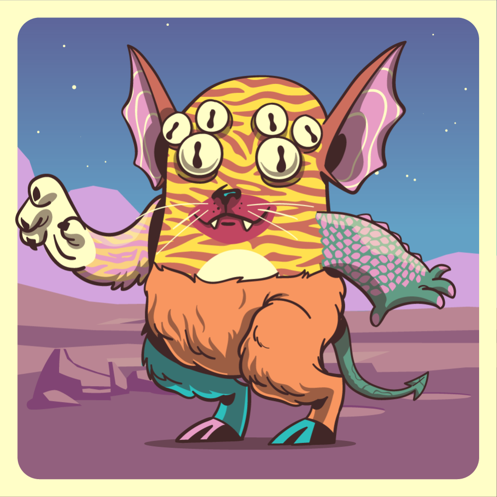 This mutant might have been a Tiger. It features white spider eyes, red cat snout, pink bat ears, pink crocodile arm, pink tiger arm, orange mad goat leg, blue mad goat leg and a green bat tail.